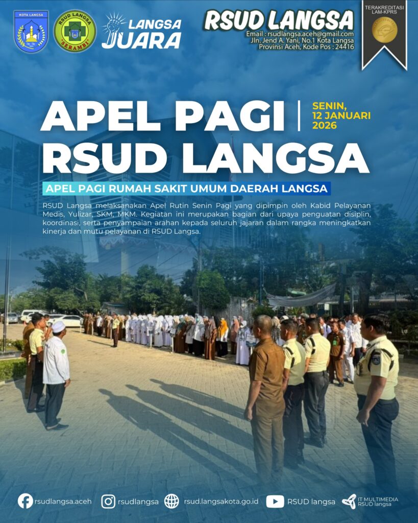 Senin, 12 januari 2026 RSUD Langsa melaksanakan Apel Rutin Senin Pagi yang dipimpin oleh Kabid Pelayanan Medis, Yulizar, SKM, MKM. Kegiatan ini merupakan bagian dari upaya penguatan disiplin, koordinasi, serta penyampaian arahan kepada seluruh jajaran dalam rangka meningkatkan kinerja dan mutu pelayanan di RSUD Langsa.