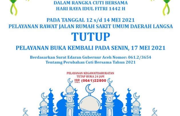PEMBERITAHUAN Dalam rangka Cuti Bersama Hari Raya Idul Fitri 1442 H Pelayanan Rawat Jalan Rumah Sakit Umum Daerah Langsa pada…