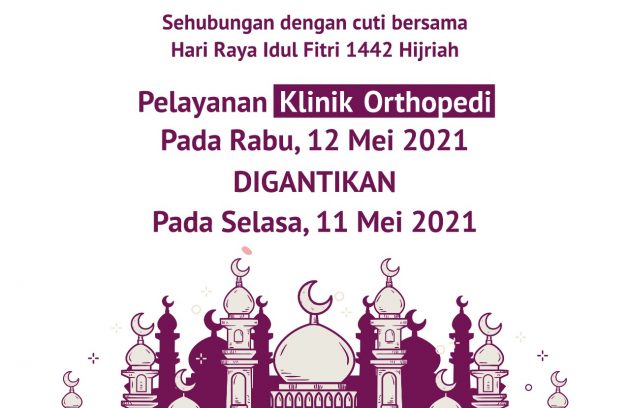 PEMBERITAHUAN Sehubungan dengan Cuti Bersama Hari Raya Idul Fitri 1442 Hijriah Pelayanan KLINIK ORTHOPEDI pada Rabu, 12 Mei 2021 DIGANTIKAN…