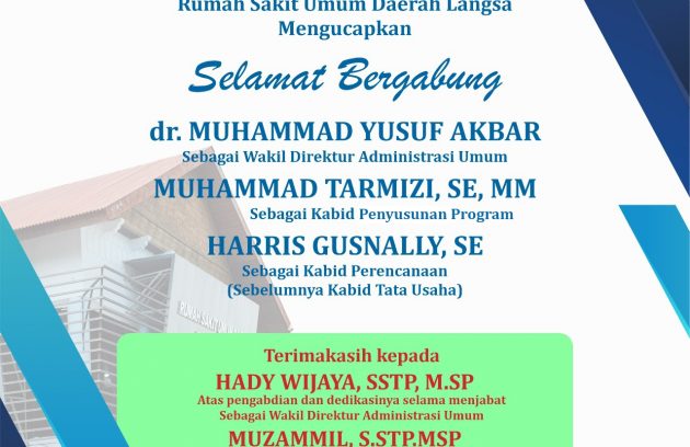 Rumah sakit umum daerah langsa mengucapkan selamat bergabung kepada dr. MUHAMMAD YUSUF AKBAR sebagai Wakil Direktur Administrasi Umum, MUHAMMAD TARMIZI,…