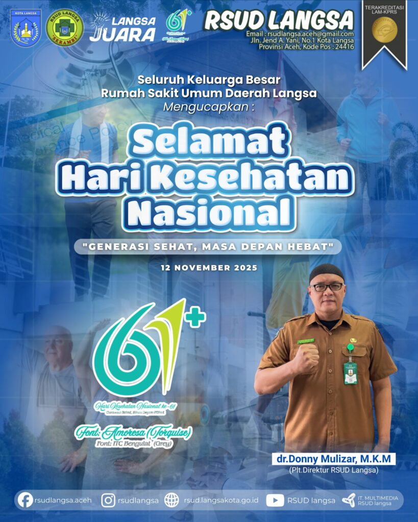 Momentum Hari Kesehatan Nasional menjadi pengingat bagi kita semua untuk terus berkomitmen meningkatkan derajat kesehatan masyarakat. Mari bersama wujudkan generasi sehat, produktif, dan berdaya saing demi terwujudnya Indonesia Maju dan Langsa Sehat.