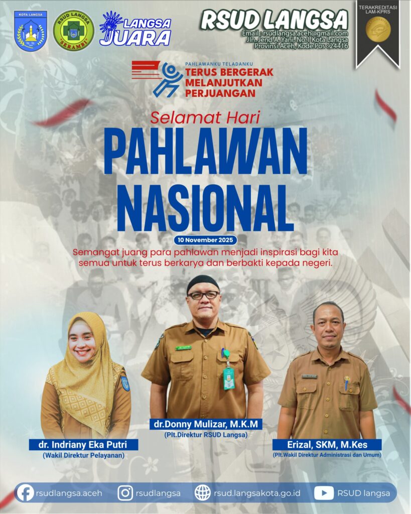 Selamat Hari Pahlawan Nasional 10 November 2025 Dengan semangat “Pahlawan Teladanku, Terus Bergerak, Melanjutkan Perjuangan”. RSUD Langsa berkomitmen untuk terus memberikan pelayanan terbaik kepada masyarakat sebagai bentuk pengabdian kepada bangsa dan negara. Mari lanjutkan perjuangan para pahlawan dengan karya dan pelayanan yang tulus .