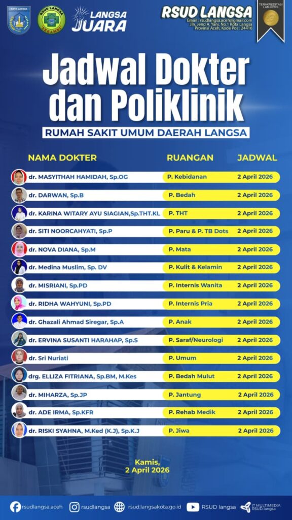 JADWAL DOKTER DAN POLIKLINIK RUMAH SAKIT UMUM DAERAH LANGSA ( KAMIS, 2 APRIL 2026 )