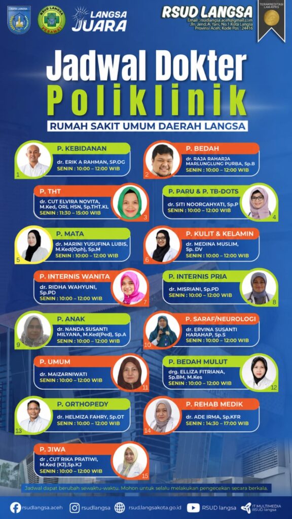 Jadwal Dokter Poliklinik RSUD Langsa – Senin, 27 April 2026