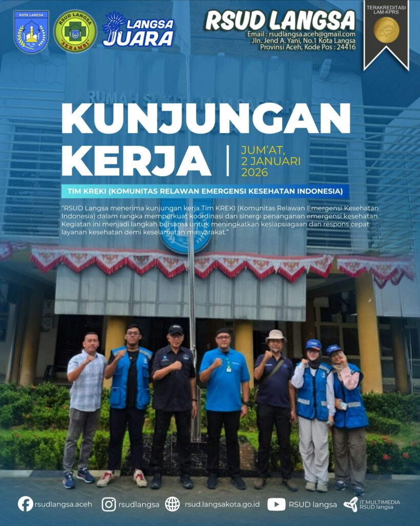 RSUD Langsa menerima kunjungan kerja Tim KREKI (Komunitas Relawan Emergensi Kesehatan Indonesia) dalam rangka memperkuat koordinasi dan sinergi penanganan emergensi kesehatan. Kegiatan ini menjadi langkah bersama untuk meningkatkan kesiapsiagaan dan respons cepat layanan kesehatan demi keselamatan masyarakat