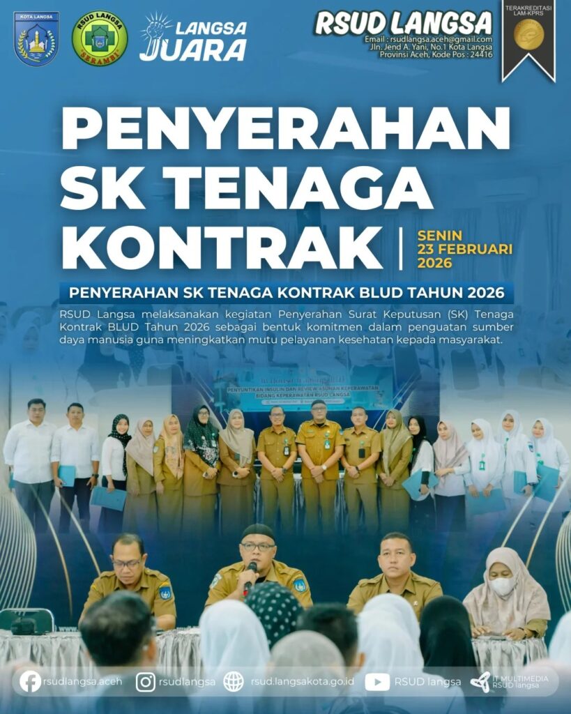 RSUD Langsa melaksanakan kegiatan Penyerahan Surat Keputusan (SK) Tenaga Kontrak BLUD Tahun 2026 sebagai bentuk komitmen dalam penguatan sumber daya manusia guna meningkatkan mutu pelayanan kesehatan kepada masyarakat.
