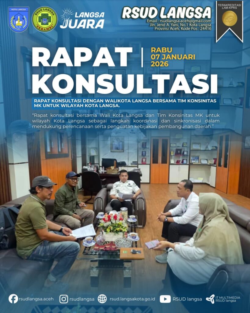 Rapat konsultasi bersama Wali Kota Langsa dan Tim Konsinitas MK untuk wilayah Kota Langsa sebagai langkah koordinasi dan sinkronisasi dalam mendukung perencanaan serta penguatan kebijakan pembangunan daerah.