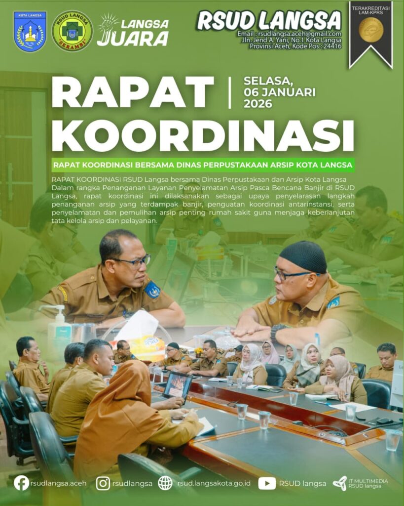 Rapat ini bertujuan untuk menyelaraskan langkah, memperkuat koordinasi, serta merumuskan strategi penyelamatan dan pemulihan arsip penting RSUD Langsa yang terdampak banjir, sehingga tata kelola arsip tetap terjaga dan mendukung kelancaran pelayanan rumah sakit ke depan.