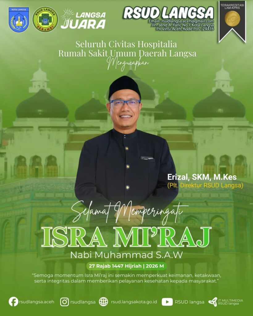 Dalam rangka memperingati Isra Mi’raj Nabi Muhammad SAW, seluruh Civitas Hospitalia RSUD Langsa mengajak kita semua untuk menjadikan momentum ini sebagai sarana refleksi diri, memperkuat keimanan dan ketakwaan, serta meneladani nilai keikhlasan, disiplin, dan tanggung jawab dalam menjalankan tugas pelayanan kepada masyarakat. Semoga peringatan Isra Mi’raj ini membawa keberkahan dan memperkokoh semangat pengabdian kita bersama. #IsraMiraj #IsraMirajNabiMuhammad #27Rajab #RSUDLangsa #CivitasHospitalia HariBesarIslam RefleksiSpiritual PelayananDenganHati