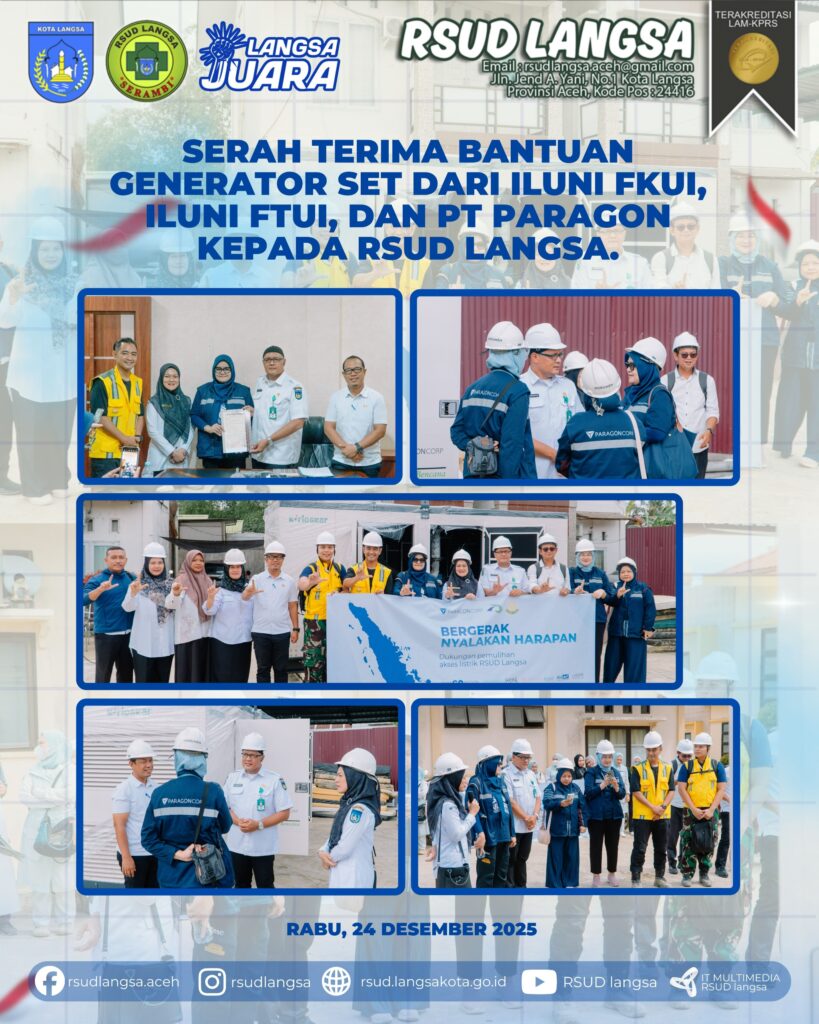 RSUD Langsa menerima bantuan Generator Set dari ILUNI FKUI, ILUNI FTUI, dan PT Paragon sebagai bentuk kepedulian dan dukungan terhadap peningkatan kualitas pelayanan kesehatan.